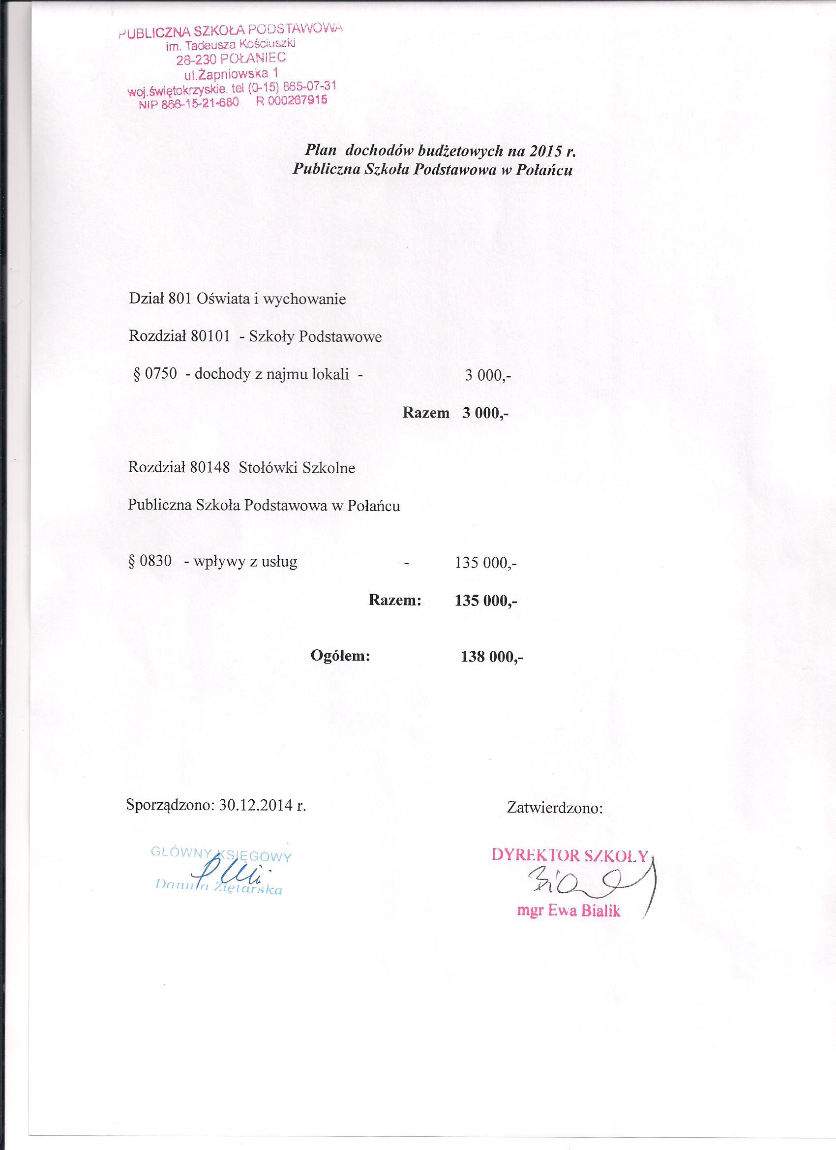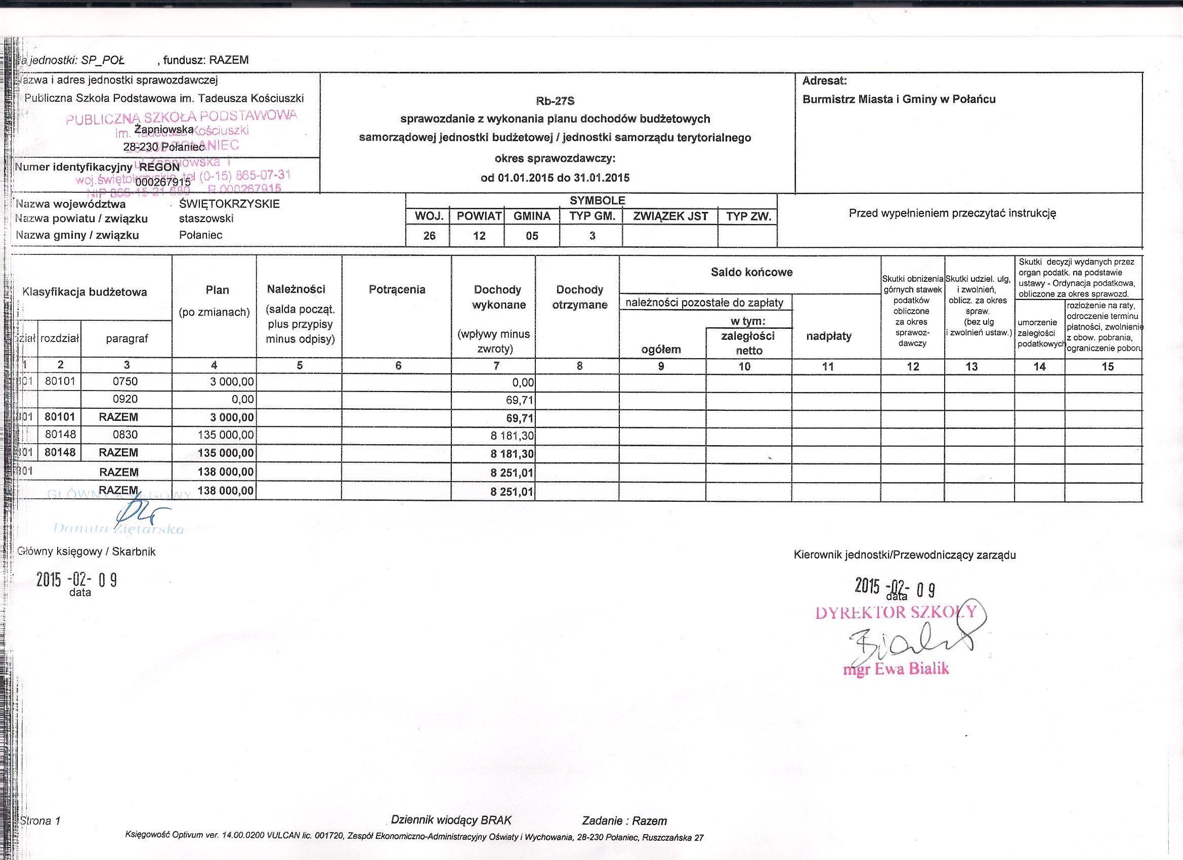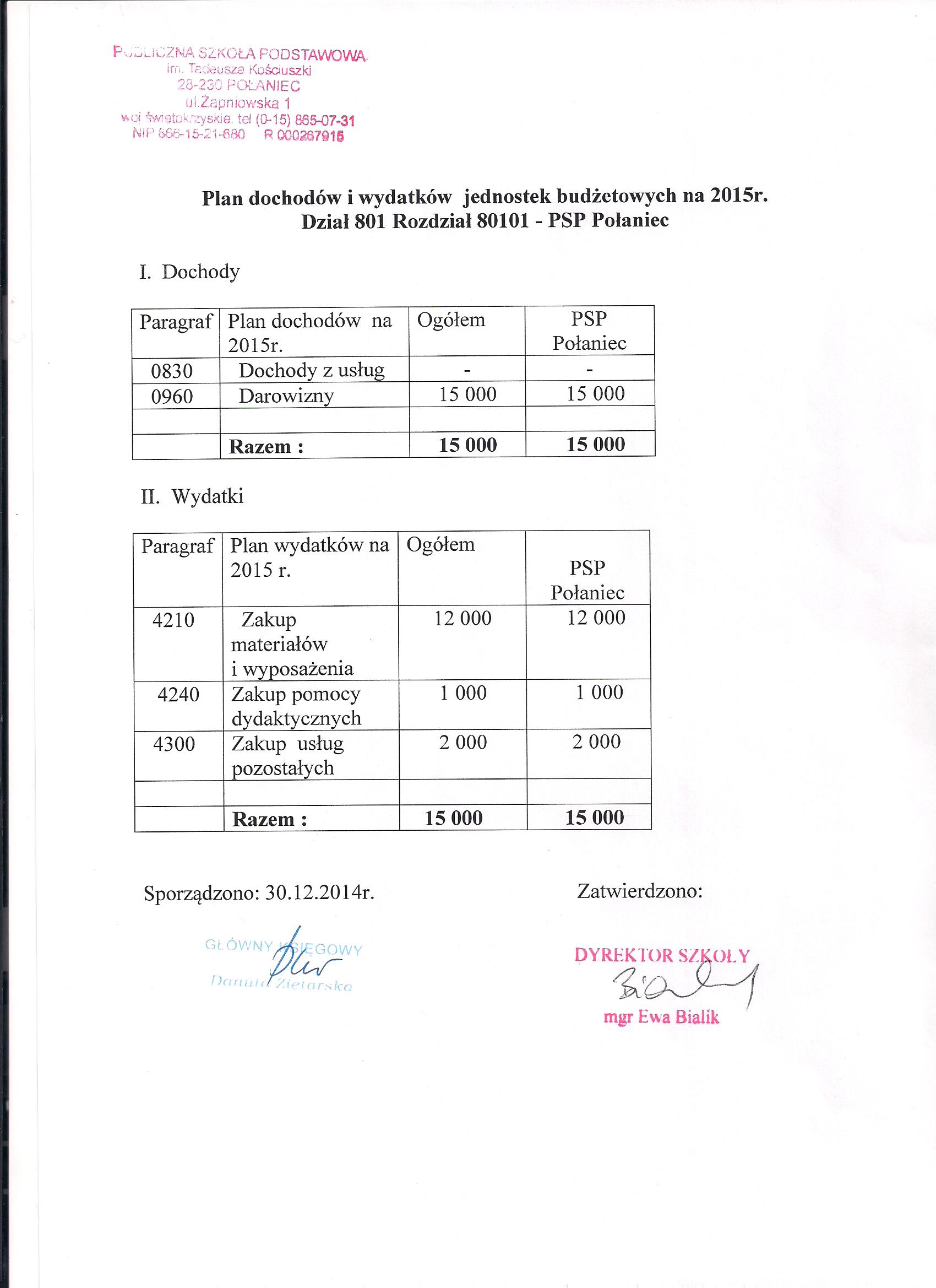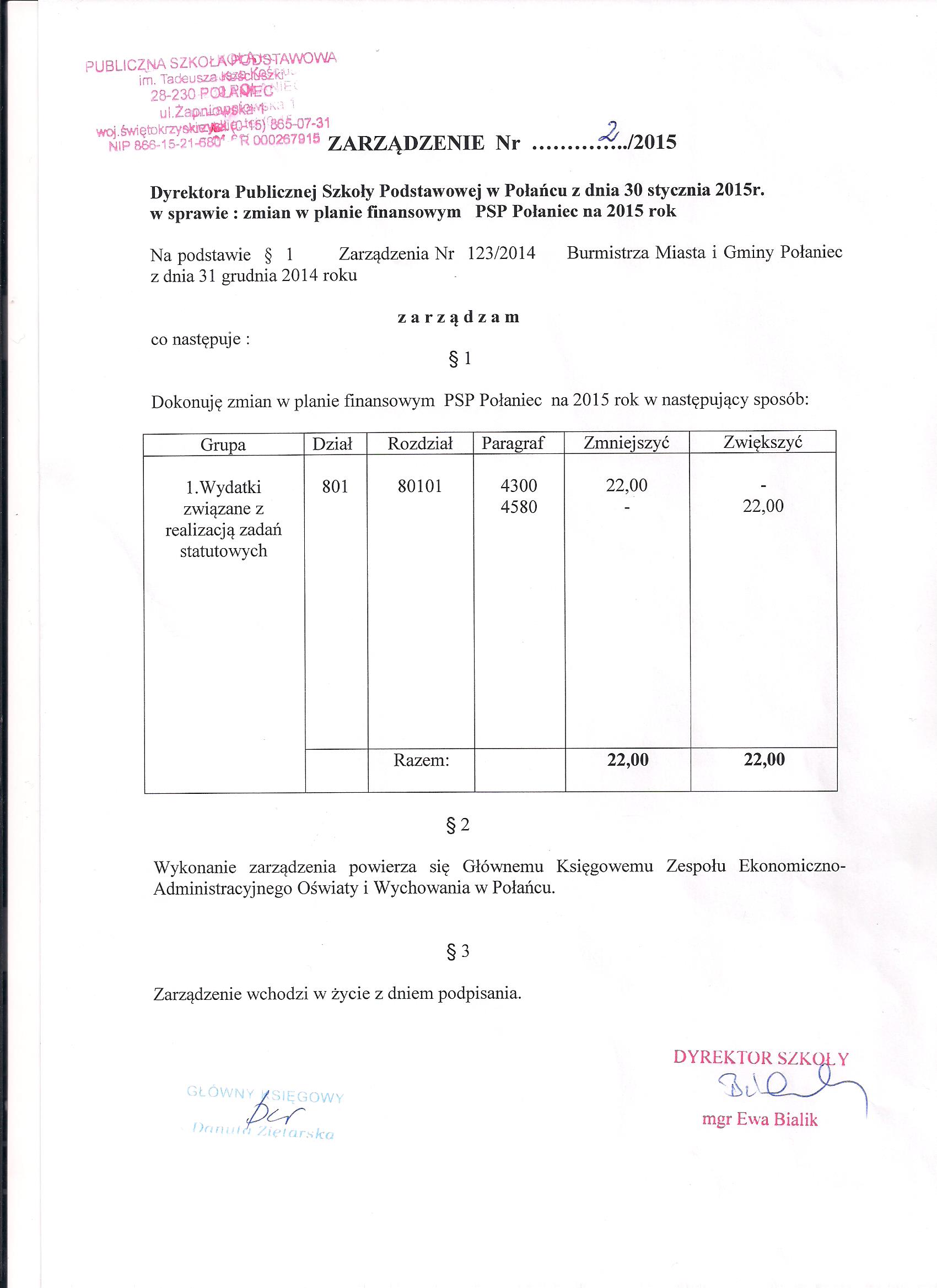 Zarządzenie Nr 2/2015 Dyrektora PSP w Połańcu z dnia 30 stycznia 2015 r. w sprawie zmian w planie finansowym