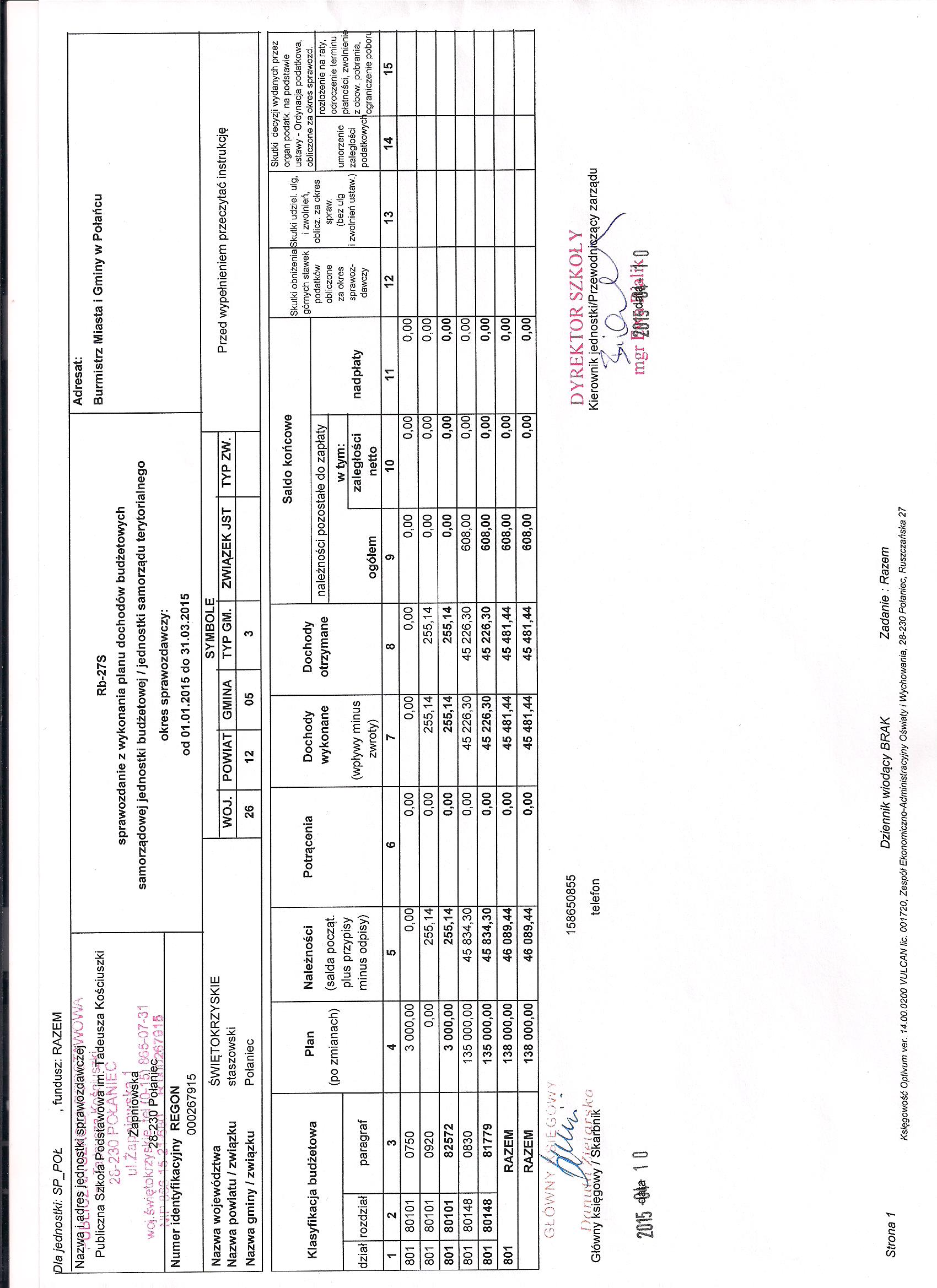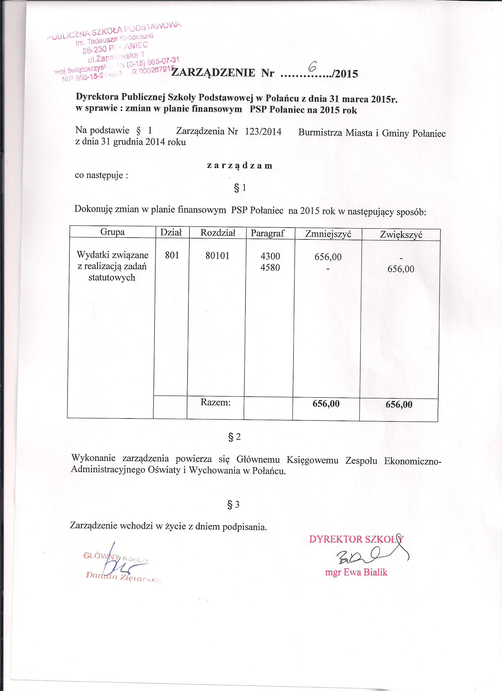 Zarządzenie Nr 6/2015 Dyrektora PSP w Połańcu z dnia 31 marca 2015 r. w sprawie zmian w planie finansowym