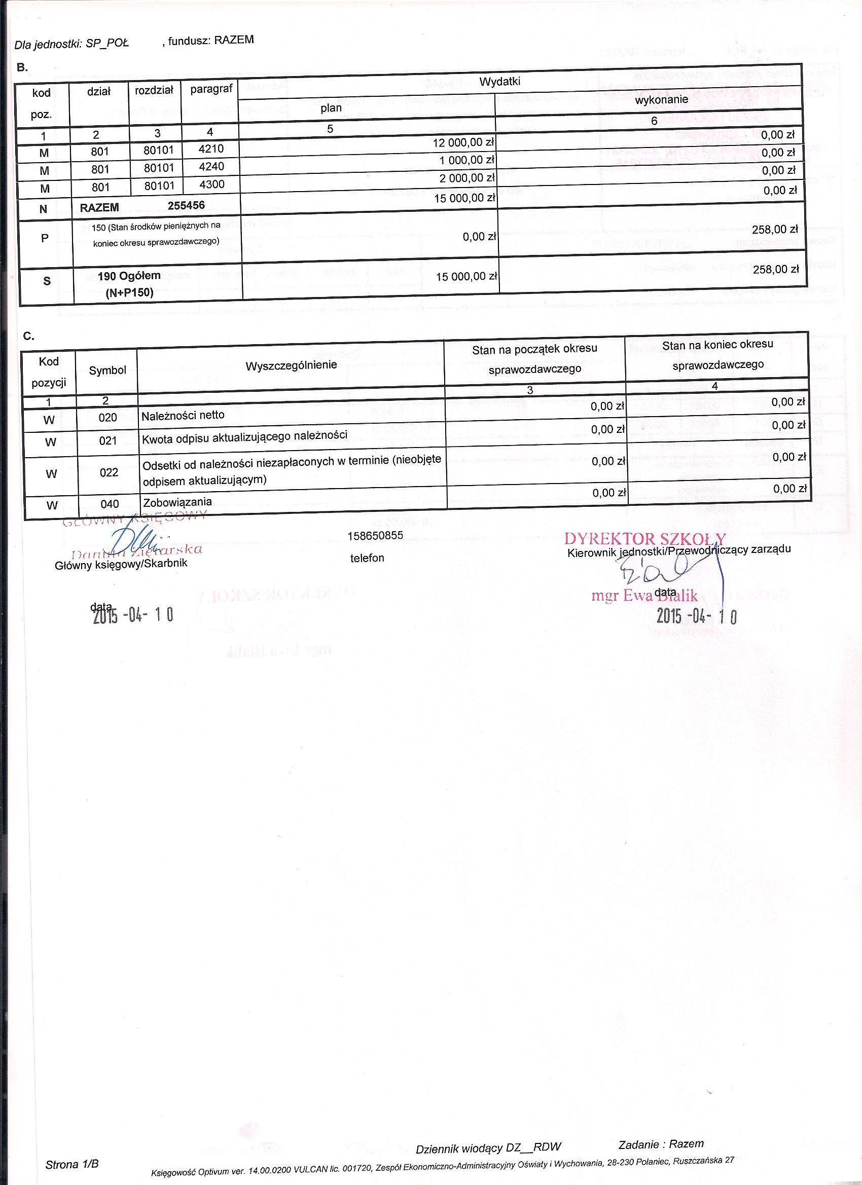 Wykonanie planu wydatków i dochodów budżetowych str. B