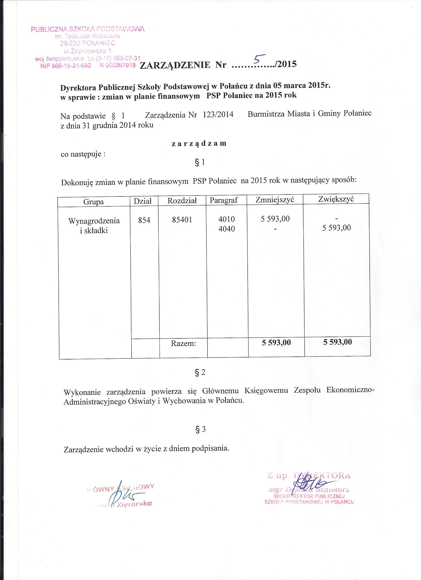 Zarządzenie Nr 5/2015 Dyrektora PSP w Połańcu z dnia 25 marca 2015 r. w sprawie zmian w planie finansowym